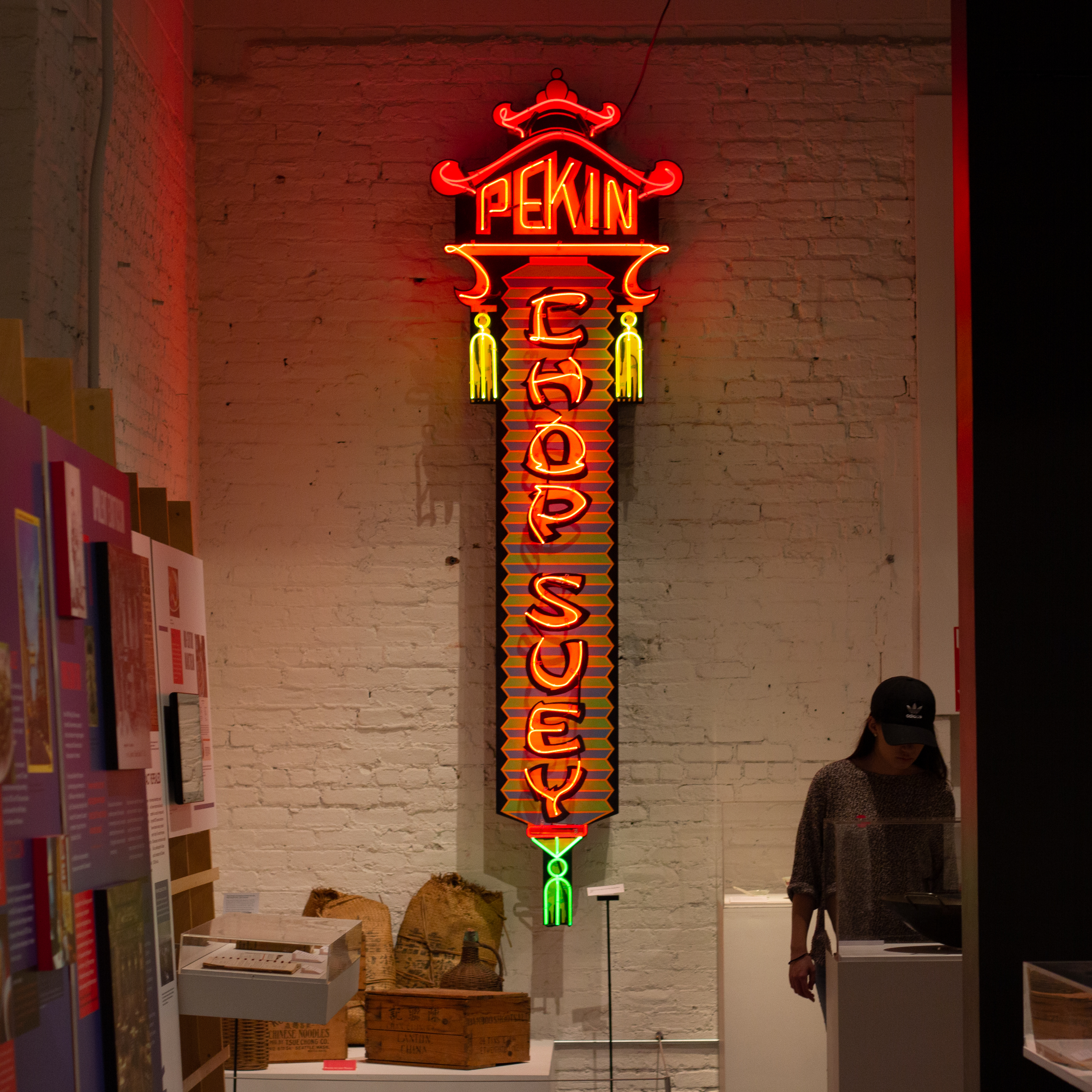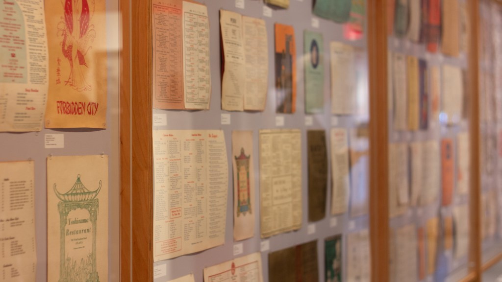 The menu timeline in the middle of the gallery was another highlight of the exhibition. The menus traced back to the 1910s, not only presenting the dishes offered at the time, but also demonstrating the gorgeous menu covers and printings. The aesthetics of the menus impressed me the most: the covers were typically water-colorings or illustrations with iconic Chinese elements, and the elegant fonts and colors of the contents were carefully selected to match the style of the cover. Following the menu timeline, we were able to see the development of Chinese American cuisine from mainly serving chop suey and egg foo young to offering various regional, somewhat more authentic Chinese . dishes.