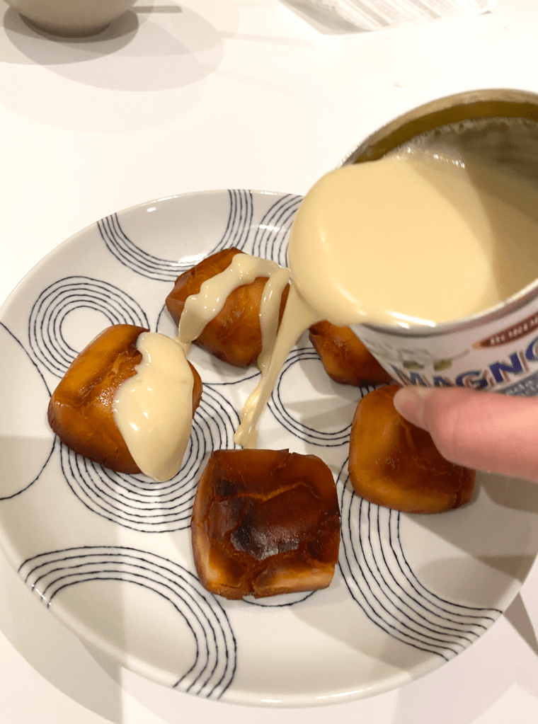 5. Serve with condensed milk either drizzled atop or as a dipping sauce!