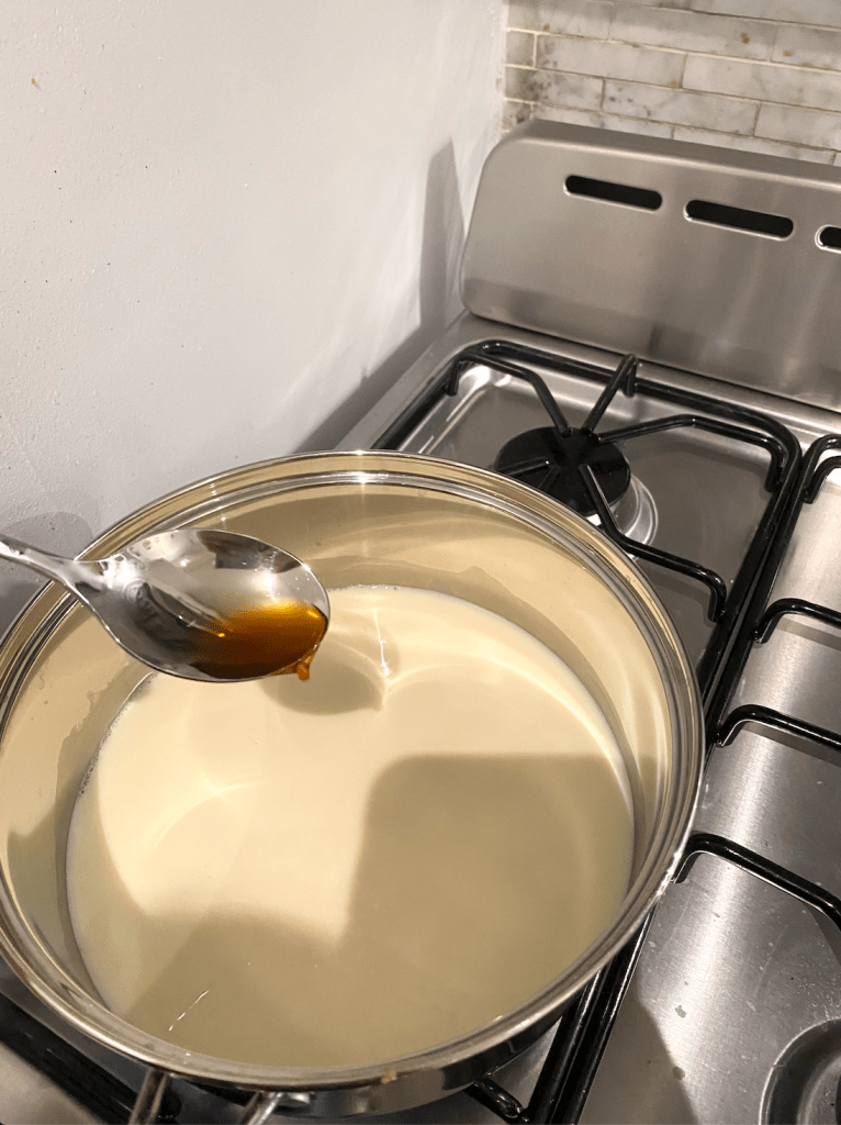 In a little stall tucked in with the numerous eateries along Roosevelt Avenue, Flushing, a little sliding window brings to view a small-framed elderly woman, or more warmly referred to as 娜娜 (Na Na) or grandma. She scoops spoonfuls of 豆腐花 (Doufu Hua), or soy bean pudding, from a hefty wooden container that seemed double her size, adding either a salty base of soy sauce or a sweeter base of honey. Not surprisingly, the honey base finds itself as a more popular option among children; and even as an adult, honey has remained my preferred choice. Wanting the same warming memory of a simple delicacy, I set out to recreate it, taking the college student-friendly route by using as few ingredients and steps as possible.