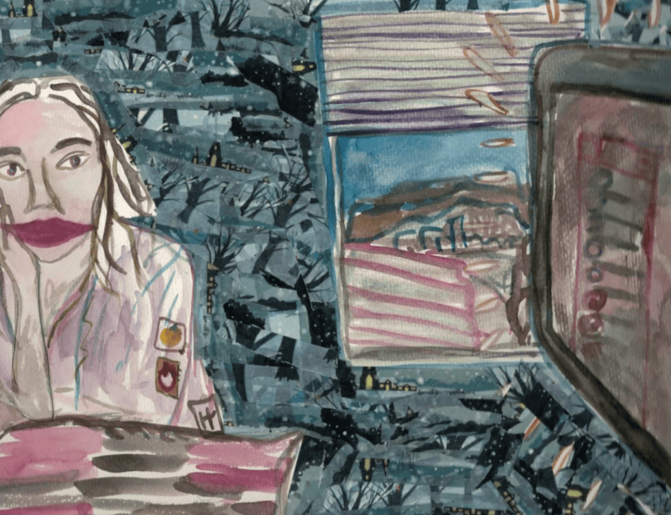 A girl leans on her pillow. Her pose is “thinking”. An exaggerated mouth, stretched out lips, mask-like; it’s a sex icon, cunning the men on the internet. But this mega-lip is also an inhibitor, preventing her from saying all that’s on her mind. She doesn’t voice everything she thinks she deserves. Her shoulder and side shows patches of dating apps. On the right is a monitor with a dating page up. It’s got a profile and some chat boxes, and the choices which she can act on. But this monitor is not in detail, it’s blurry. It’s not what she should be focusing on, nor we. Instead, the window behind is clear for the distance in proportion. The roofs of houses, the city and mountains in the background haven’t been considered, but they should. Though, the monitor is still emitting its light in its flashy allure. The walls are dark and it’s about to be an even darker and lonely night.