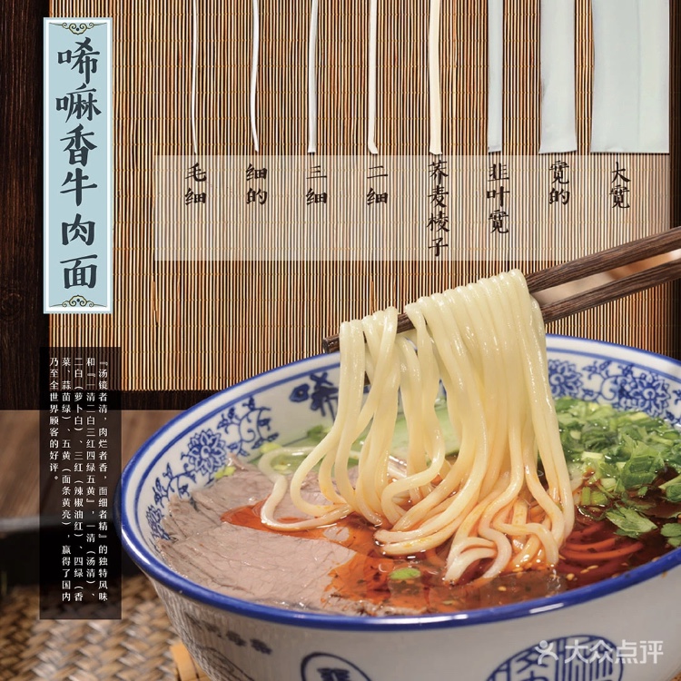 What I love the most about this dish is the freedom to choose the thickness of your noodles. There are several sizes to choose from: if you like cylindrical noodles, you can choose from san xi, er xi, xi, and mao xi (三細, 二細, 細, 毛細). If you like flat noodles, choose from da kuan, kuan, or jiu ye (大寬, 寬, 韭葉). If none of these fits your taste, qiao mai leng (蕎麥楞) must be the one. It is my personal favorite. (See above image for differences in thickness.)