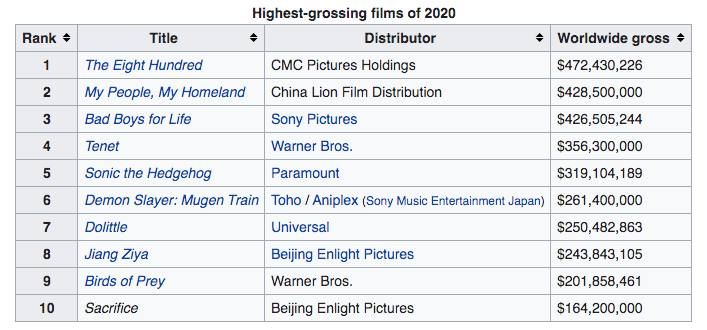 As Asian countries have generally been managing the pandemic better than Western countries, Asian films have also overtaken Hollywood films in the worldwide box office. For the first time ever, five of the top 10 grossing movies of 2020 are from China and Japan. For the first time since 1997, none of those top 10 films include a film by Disney. While this is definitely a feat to be celebrated for any Asian film enthusiast or anyone that wishes to see more diversity at the box office, no movie has yet surpassed the $500 million box office mark, which is a first since 1995.