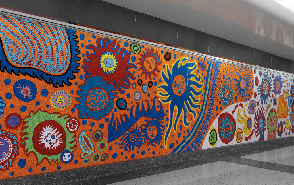 A Message of Love Directly From My Heart unto the Universe sits in full view of the public, in the main Madison concourse between 46th and 47th street. The 120 foot wide installation expresses messages of love, peace, and universe, with vibrant suns and contrasting colors. There are multiple motifs throughout the piece, allowing the viewer to explore the art in its entirety, almost like a journey while walking past it.
