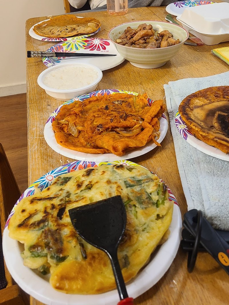 Pictured here: my attempt at homemade Korean jeon (savory pancakes made with scallions, kimchi, etc.) and stir-fried chicken