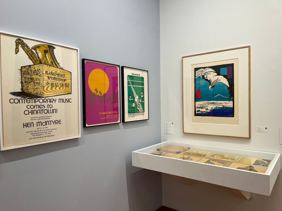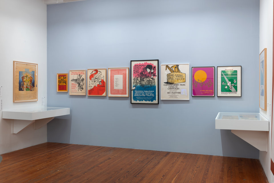Walking into the first room of Legacies: Asian American Art Movements in New York City, you are first greeted by David Diao’s large-scale geometric abstract painting Odd Man Out as well as one of Isamu Noguchi’s famous Akari lamps hanging from the ceiling. But as you look to the right, lining the wall are 8 bold framed prints; some posters for community events, some printed pieces of writing. On the walls flanking the display are two glass boxes filled with other printed ephemera, a collection of poetry and illustrations. This room is representative of the earliest era of this collection, focusing on the 60s and 70s, around the time the term “Asian American” was first coined in 1968.